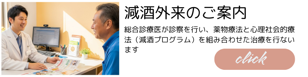 総合診療医が診察を行い、薬物療法と心理社会的療法(減酒プログラム)を組み合わせた治療を行ないます。