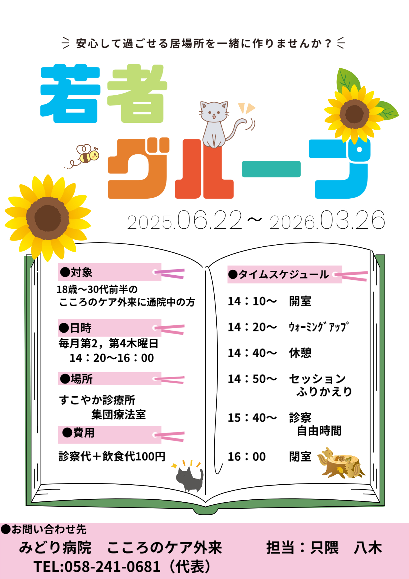 18歳から30歳ぐらいまでの学校や会社などどちらにも所属していない方を対象に月2回のグループワークを行っています。通院中の方が対象です。